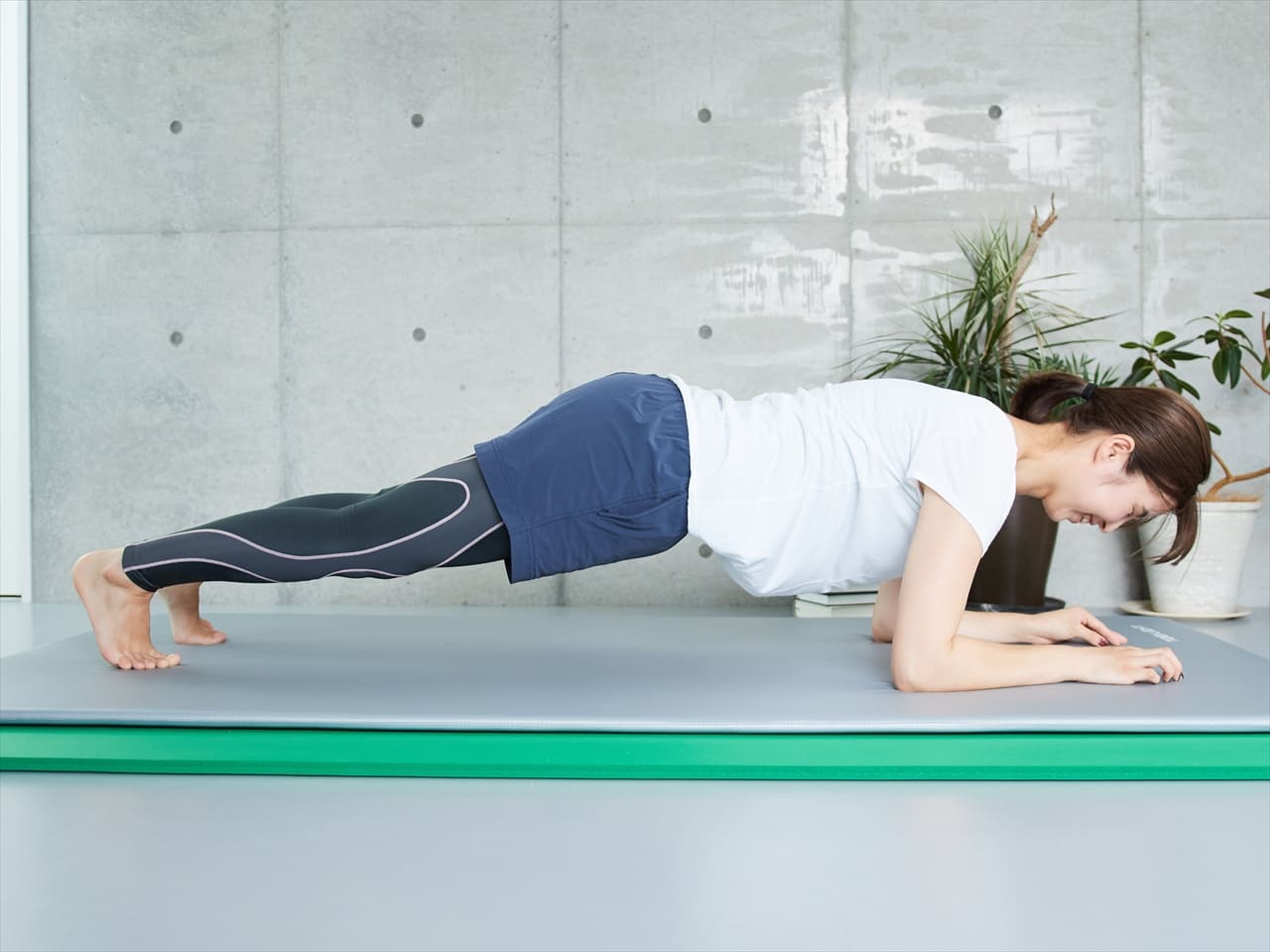 うつぶせになり、上の角度を90度にして肘を床につき、つま先立ちで体を支え、顔を前に向けて足から首筋までが一直線になるようにして、そのまま45秒キープします。