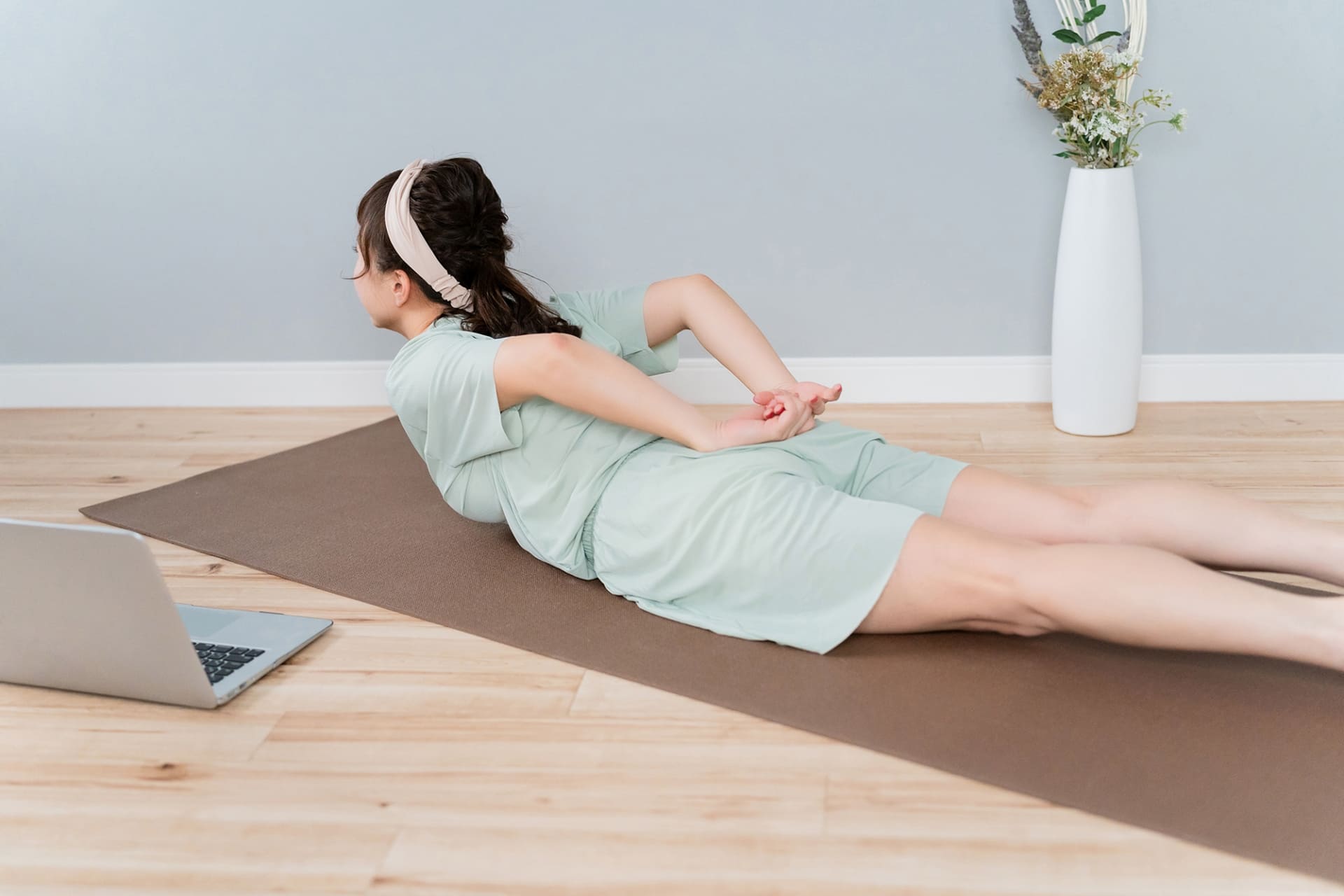 うつぶせに寝てたら両手を腰のあたりで組んで、上半身をゆっくり上げていき、一旦停止してゆっくり元の位置に戻します。