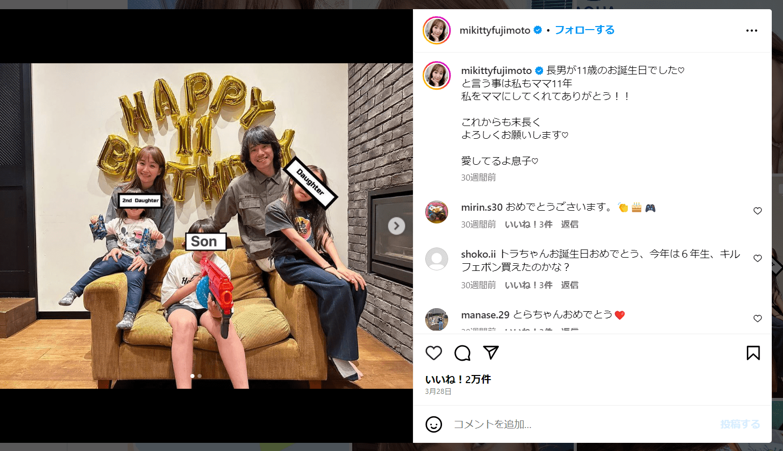 結婚後もモデルやタレントを続けていて、11歳の男の子、7歳と3歳の女の子を持つママです。