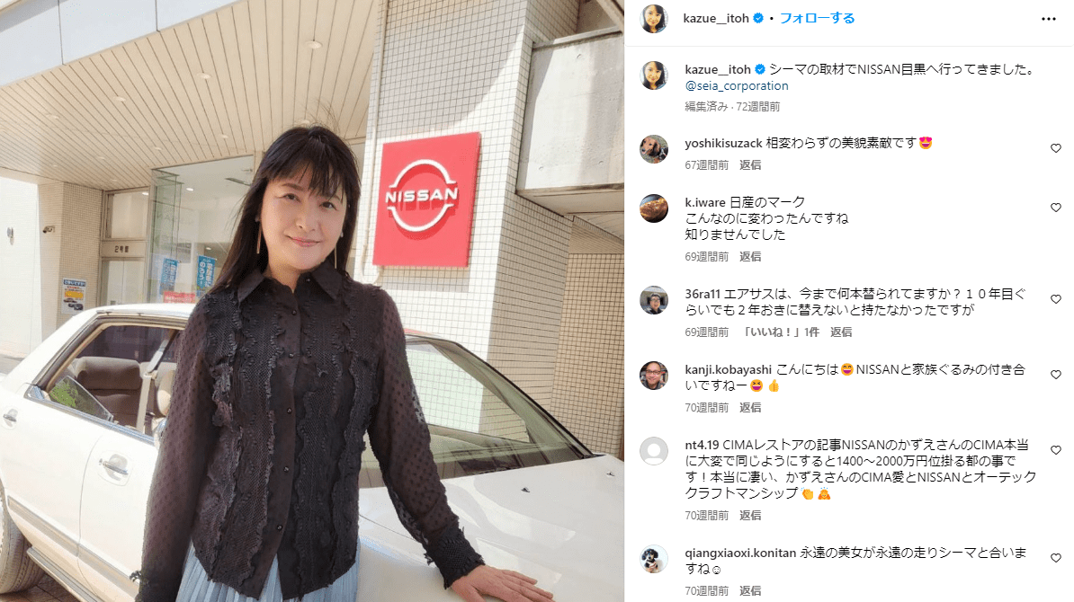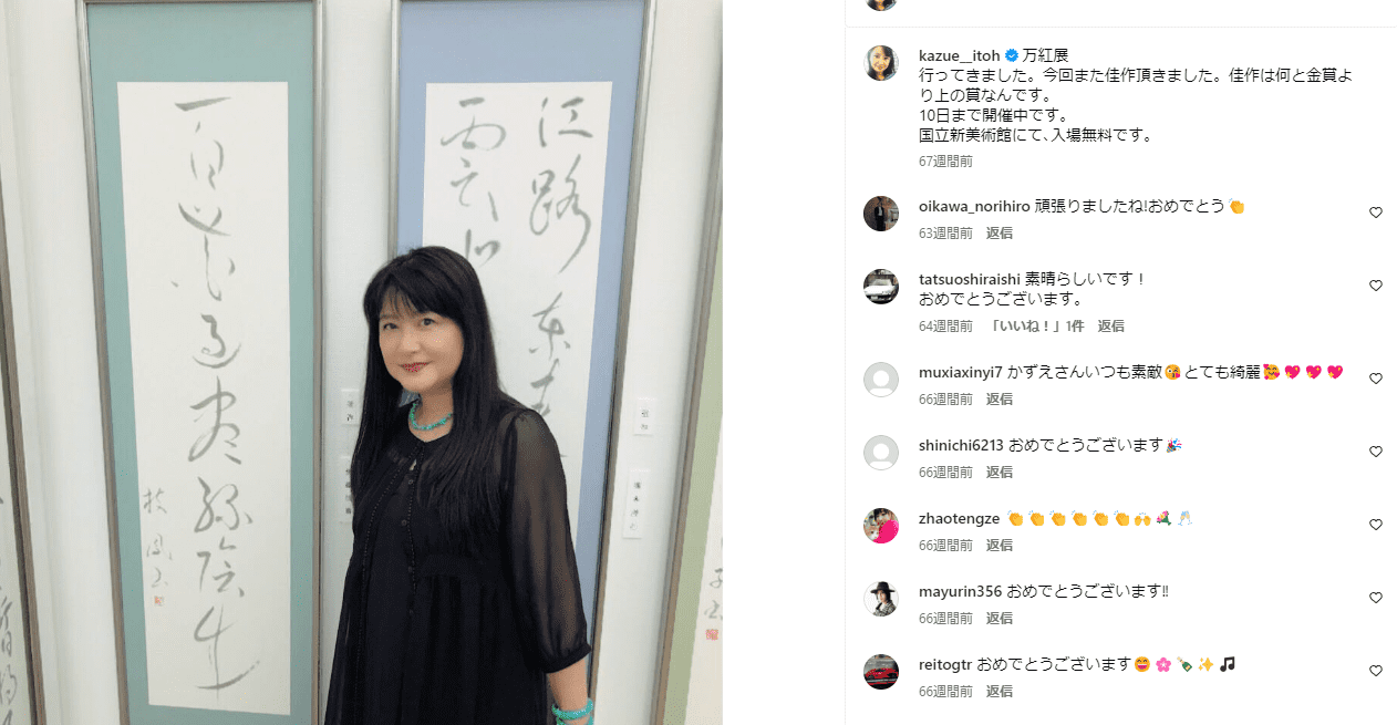 伊藤かずえさんは、(株)ホリプロ所属で女子大生の母と役者。女優・タレントに加え歌手でもあり、YouTubeチャンネルも開設しています。書道:進士四席 かな:専科三席、雅号は伊藤枝鳳(しほう)y31シーマを平成2年から乗り続けています。