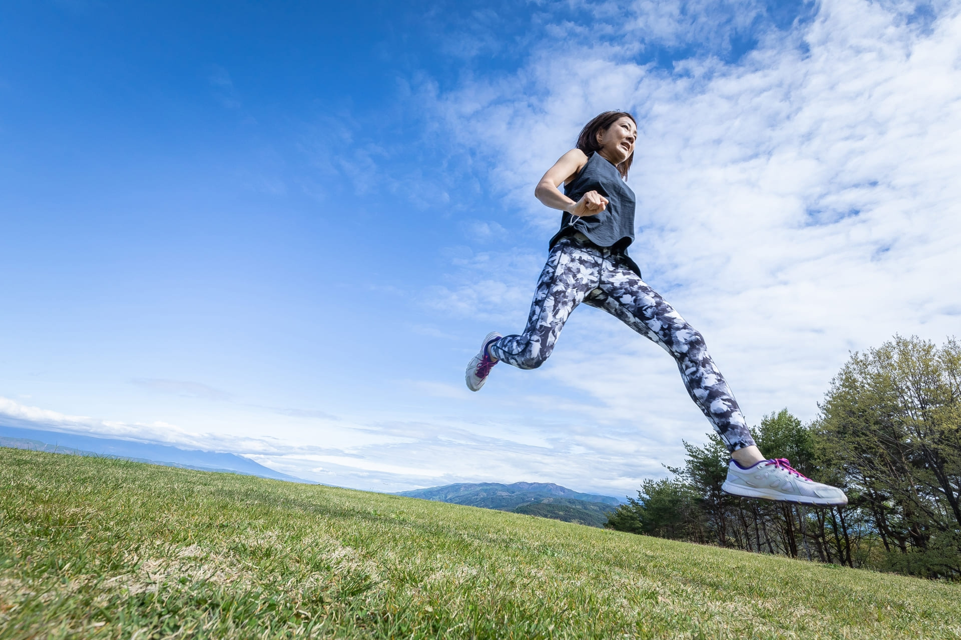 大きなストライドで前進しながらジャンプを行います。1分間でできるだけ広い範囲をカバーするようにします。