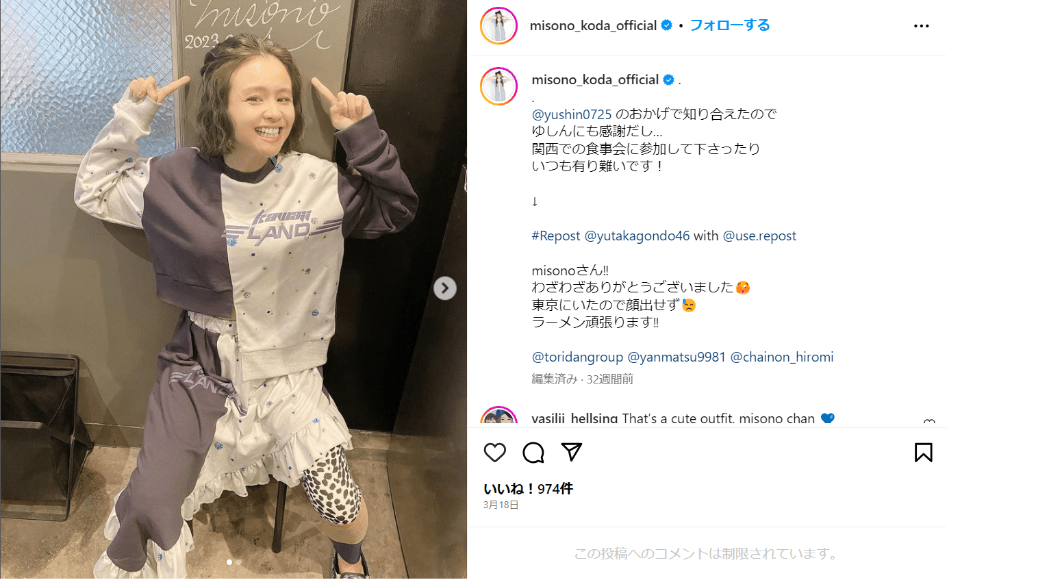 misonoさんの現在の体重は公表されていませんが、最近の公式Instagramの投稿を見る限り、太っているとは思えませんね。 デビュー当時と変わらない体型に見えるので、42kgくらいのシンデレラ体重なのではと推測できます。 激やせダイエットをした後、misonoさんはしっかり体重維持しているのですね。