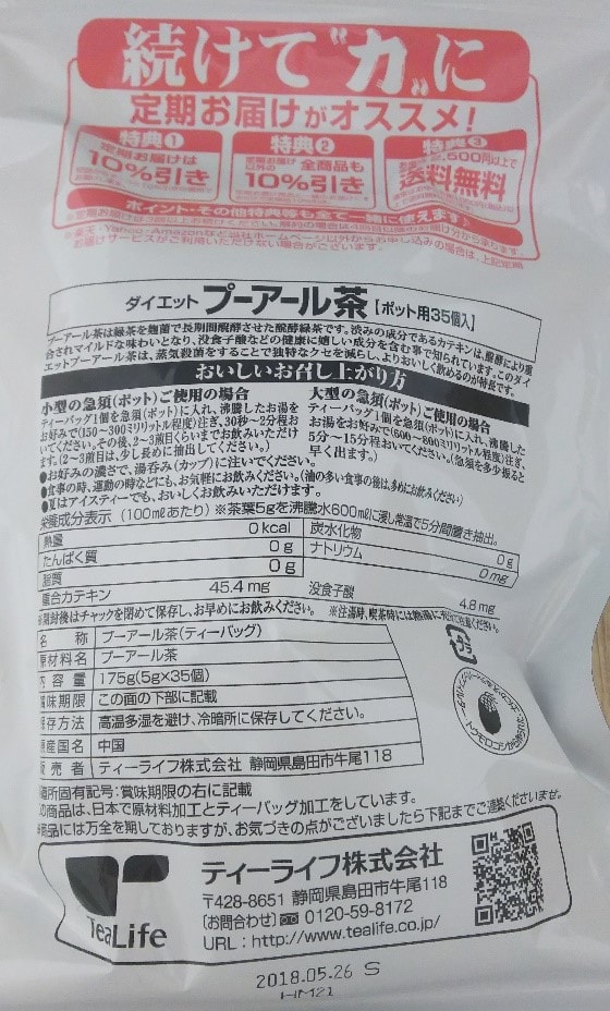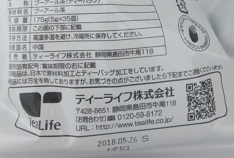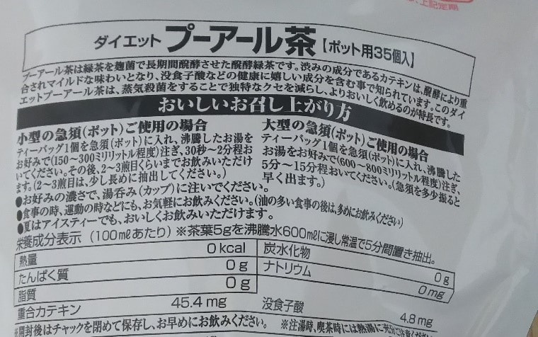 添加物などは、一切加えられておらず、プーアール茶のみの表示になっています。
