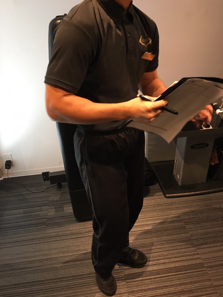 セッション終了後は、更衣室に戻り、シャワーを浴びて、着替えます。そして、来た時に渡された黒いバッグに 使用したトレーニングウェアやタオル、バスタオルを入れて 受付に返却し終了です。