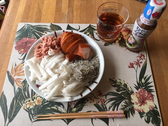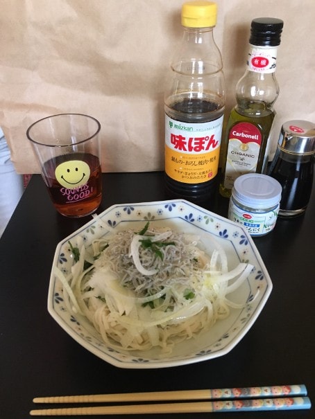 オニオンスライスで野菜を摂り、ちりめんじゃこでタンパク質を摂取します。タレで糖質やカロリーを摂りたくなかったので、ポン酢で食べました。