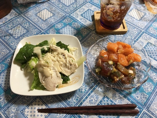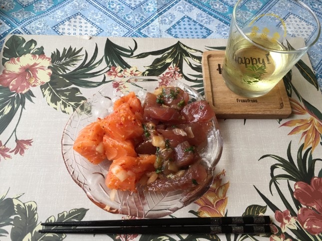 そして夕食の前に 間食として、昨夜の夕食の残りである“サーモンとまぐろのハワイアンポキ風”を食べました。