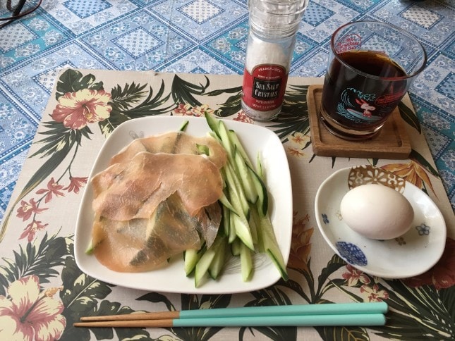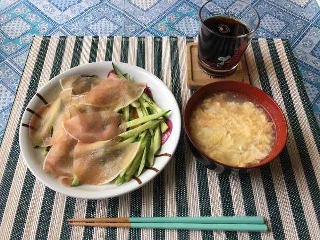 朝食は、昨日と同じく生ハムサラダと卵スープを作りました。
