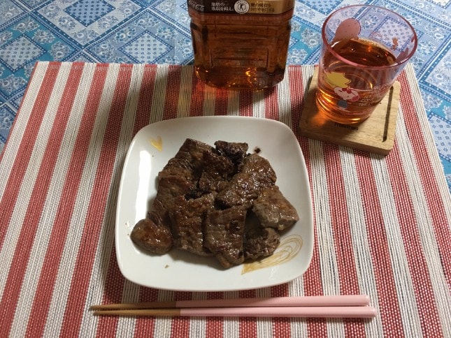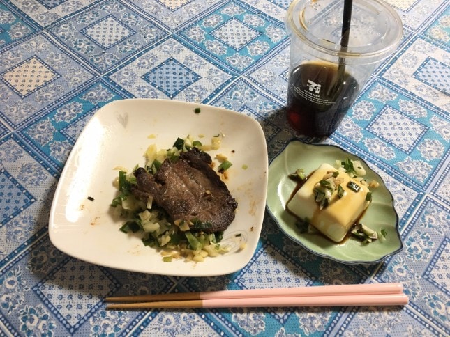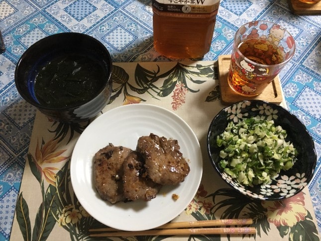 夕食は牛タンの焼いたものと 薬味野菜、わかめスープを作って食べました。