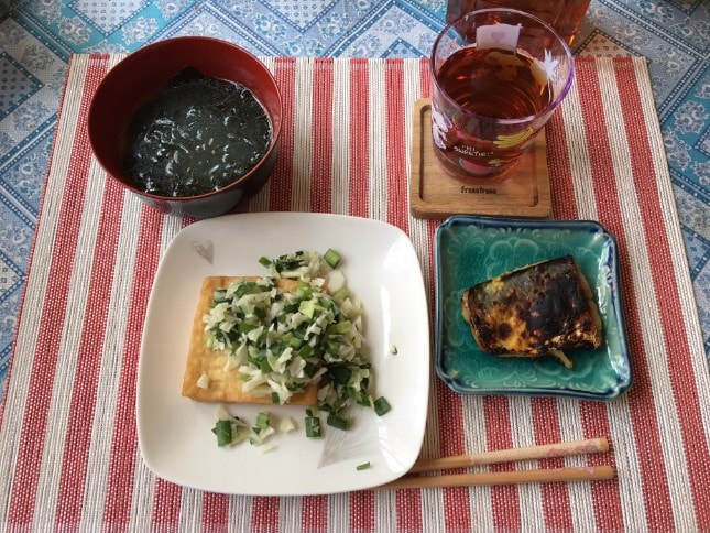 昼食は、さわらの塩焼きと厚揚げ、わかめスープ。