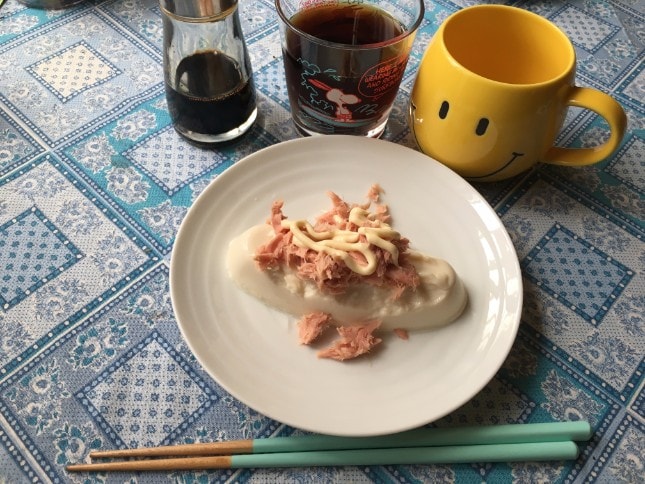 タンパク質の摂取を考えて、オイルフリーのツナにマヨネーズをかけて食べました。
