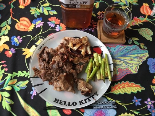 朝食は、牛肩ロース、アスパラガス、椎茸を焼いたものを食べました。