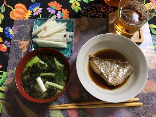 夕食は、わかめとねぎの味噌汁、大根の浅漬け、鯛の煮付けを食べました。