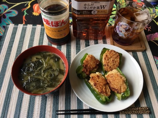 昼食は、鶏ミンチと粉豆腐を使用したピーマンの肉詰め、わかめの味噌汁を食べました。