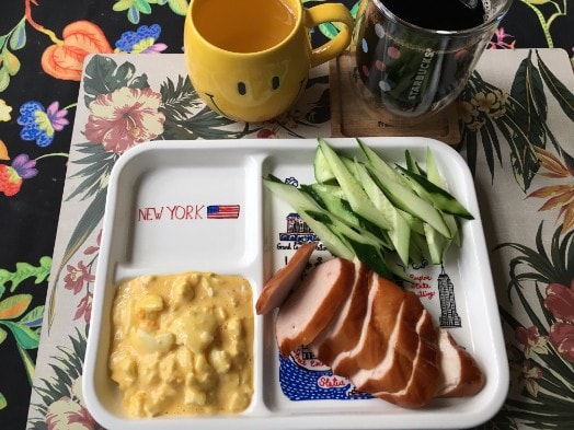 朝食は、サラダチキン、きゅうりのサラダ、ゆで卵とマヨネーズで作ったタルタルソースを食べました。