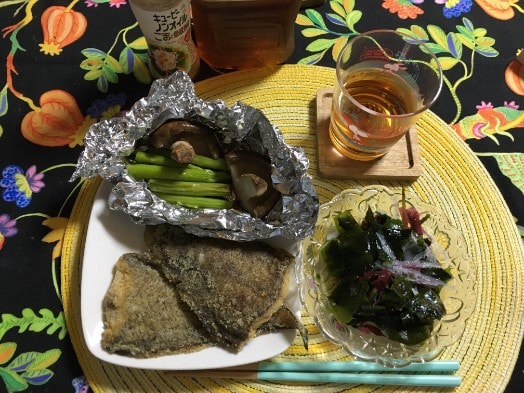 夕食には、海藻サラダ、舌平目のムニエル、アスパラとしいたけのホイル焼きを食べました。