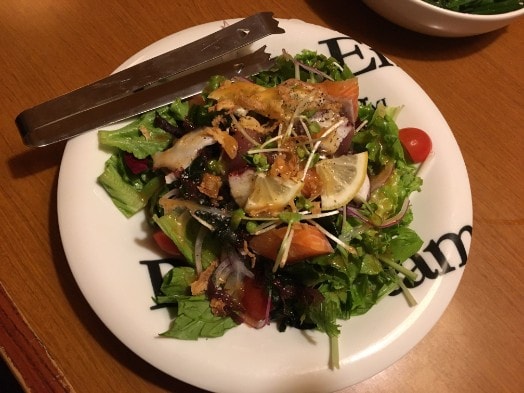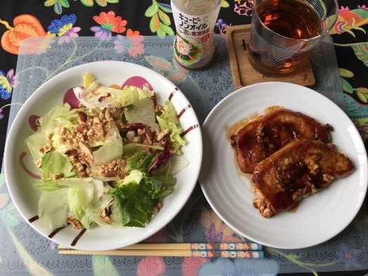 昼食には、レタスとナッツのサラダ、豚の生姜焼きを食べました。