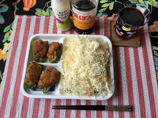 朝食は、コールスローサラダとピーマンの肉詰めを食べました。