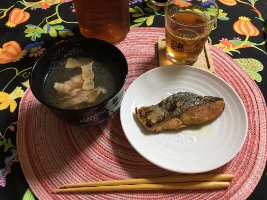 夕食は、サーモンのムニエルとベーコンと海藻麺のコンソメスープを食べました。