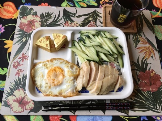 なので、朝食と呼べるかはわかりませんが、今日の1回目の食事として卵焼き、サラダチキン、わかめときゅうりの和え物を食べました。