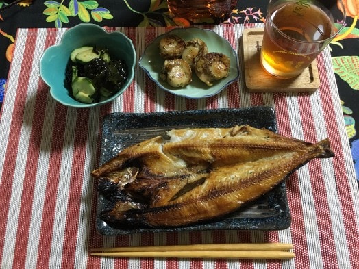 夕食には、ほっけの開き、ほたてのバジルソース焼き、きゅうりとわかめの和え物を食べました。