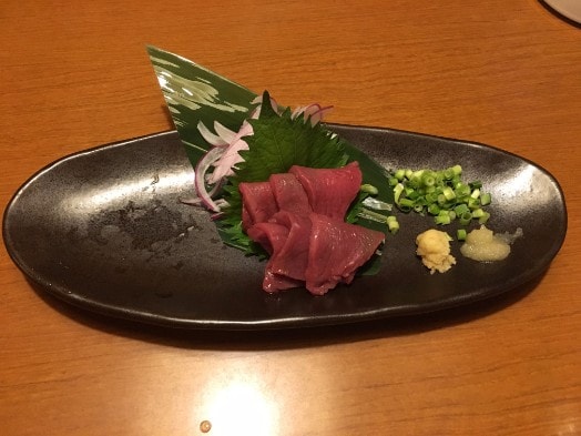 夕食は、海鮮居酒屋で 馬刺し、海鮮サラダ、ねぎとしらすのサラダ、お造り盛り合わせを食べました。