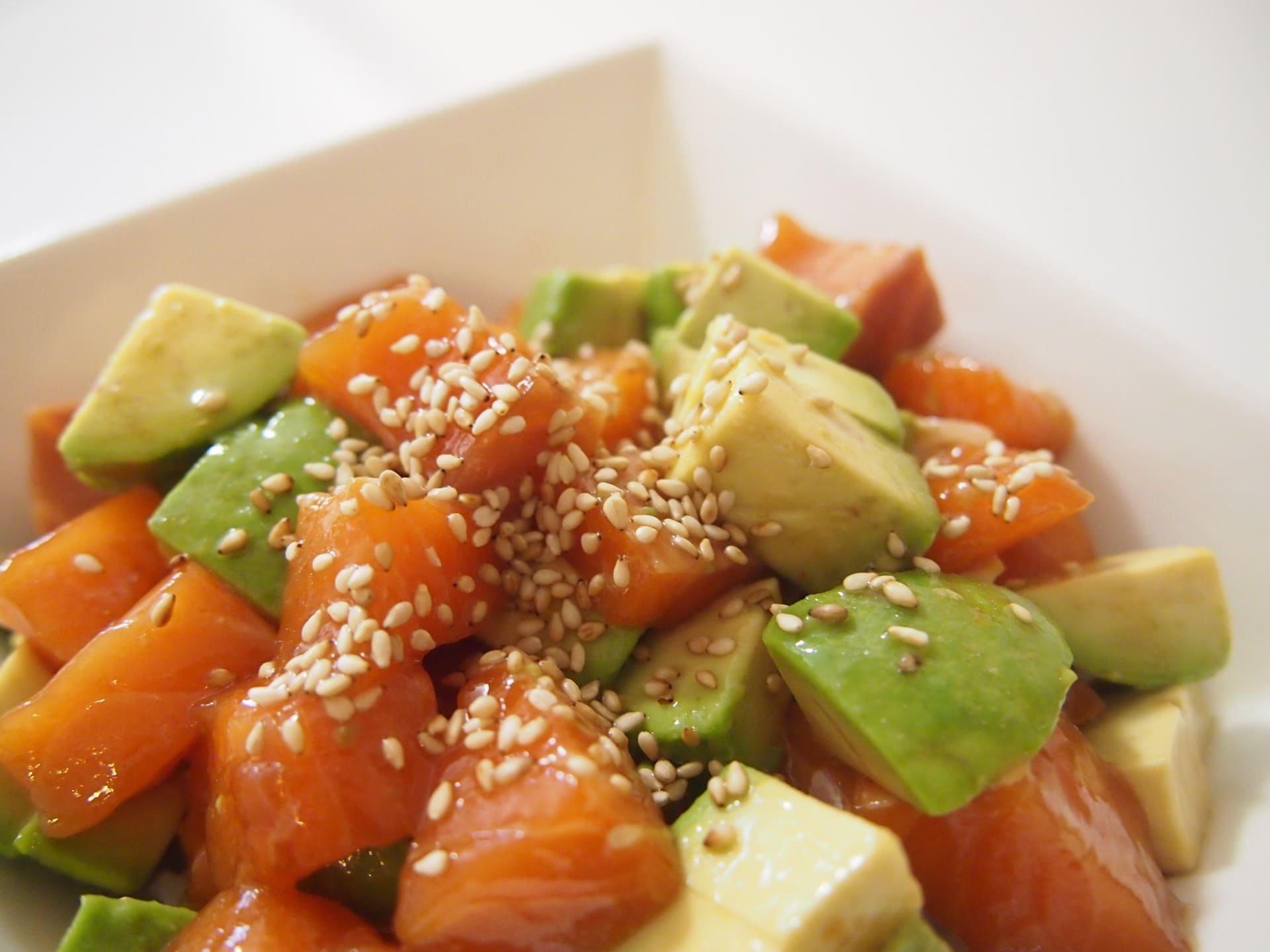作り方:サーモンとアボカドを1cm角に切り、その他の調味料で和えたあと白ごまを散らします。