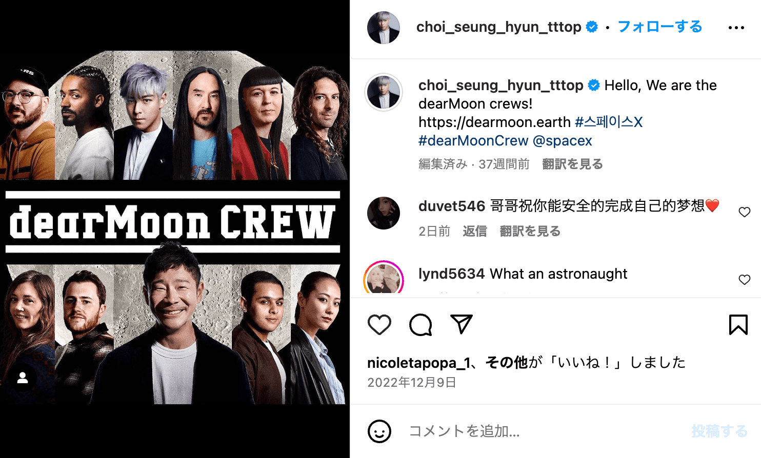 今話題の前澤社長が率いる「Dear Moon」計画のクルーの一人です。