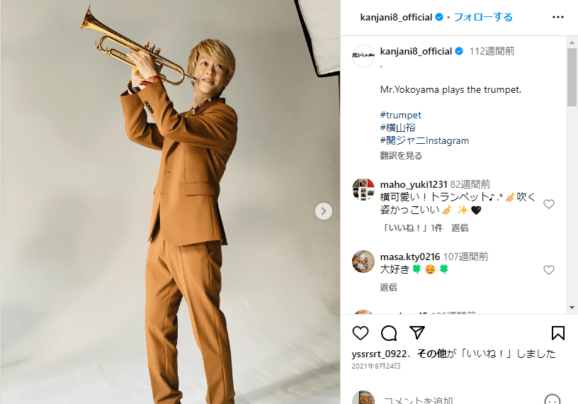 関ジャニ∞でのメンバーカラーは「黒」。担当楽器はトランペット、ギター、パーカッションなどです。